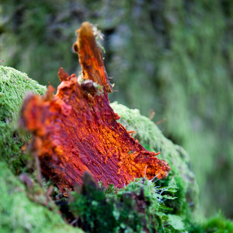 The intention was to retake some shots (with the tripod this time) of a piece of bright red and orange bark that had fallen into a mossy hole in a broken tree. While Lola was running with a collie through the undergrowth I mounted the camera on the tripod and set about shooting the striking piece of bark.