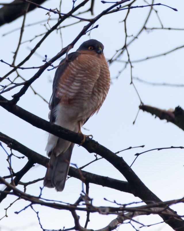 This afternoon, it flew into the tree at the bottom of our garden, perched high up, waiting for prey such as the tits and finches that frequent our seed feeders. I took a few shots, although it was just too far away for a real cracker.
